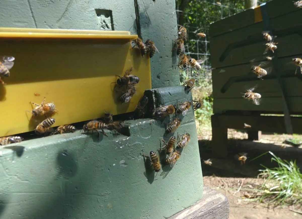 Colonies make a lot of noise, which are challenging to interpret. Before a swarm, some bees run on the comb. Because of this, some beekeepers claim to be able to anticipate when a colony is about to swarm. Queenless hives are sometimes noisy and roaring. Orientation flights (photo) are loud.