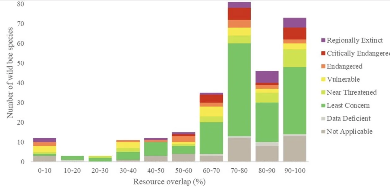 The graph shows how resource overlap predominates. This is true for most endangered species (red/orange). Other studies indicate that honey bees do displace wild bees. “Until we fully understand the complex interactions between managed honey bees and threatened wild bee species, it would seem prudent to use the precautionary principle and avoid placing honey bee hives in places close to known or suspected populations of threatened bee species during their active season.”