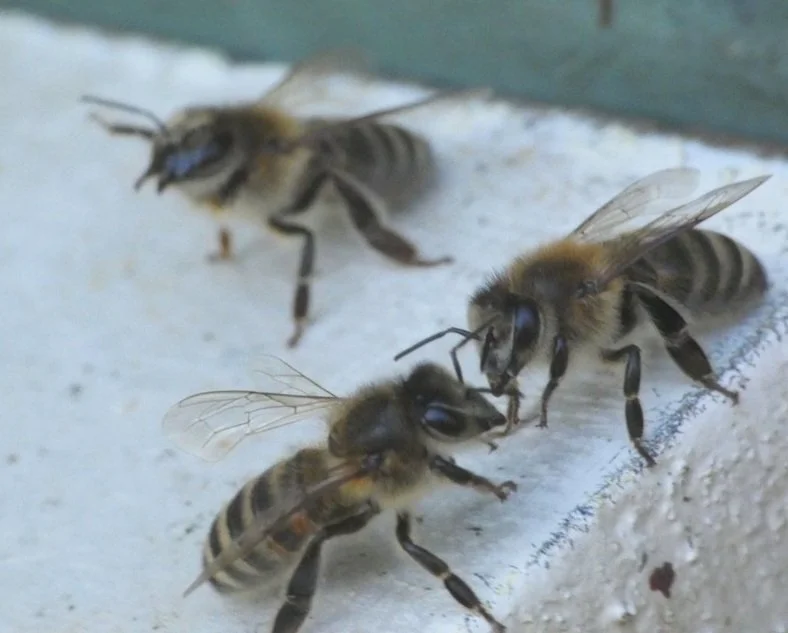 Bees’ antennae are bristling with sensors, including CO2 and magnetic field detectors. Touch sensors detect air movement which, for example, enable them to orientate their bodies for trophallaxis (sharing pheromones as they share food). When bees touch their antennae, they receive information; they do not have a conversation (except “I’m here”), which I find disappointing. Since their eyesight is poor and they have to spend a lot of their lives in the dark, their antennae are like sensory walking sticks.