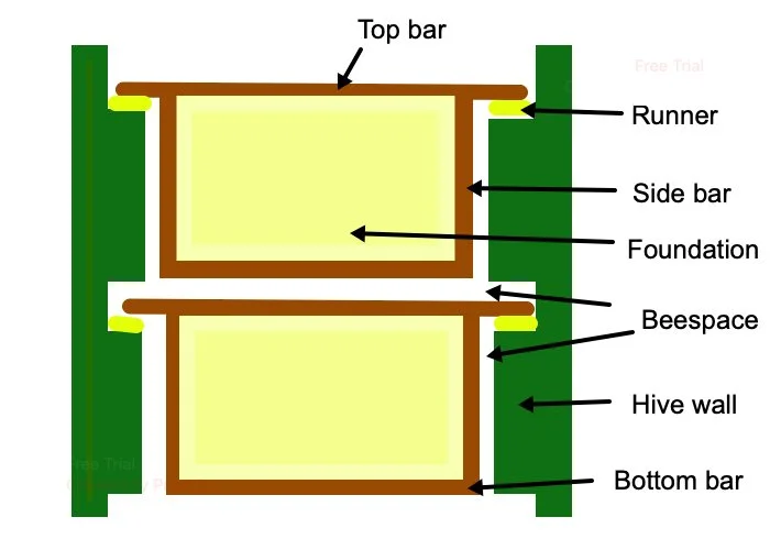 In modern hives, bees build honeycomb on the top bars or foundation. Each top bar is a stick that spans the box. Each end of the stick is called a lug. These are supported by recessed horizontal metal or plastic strips on the walls called runners.