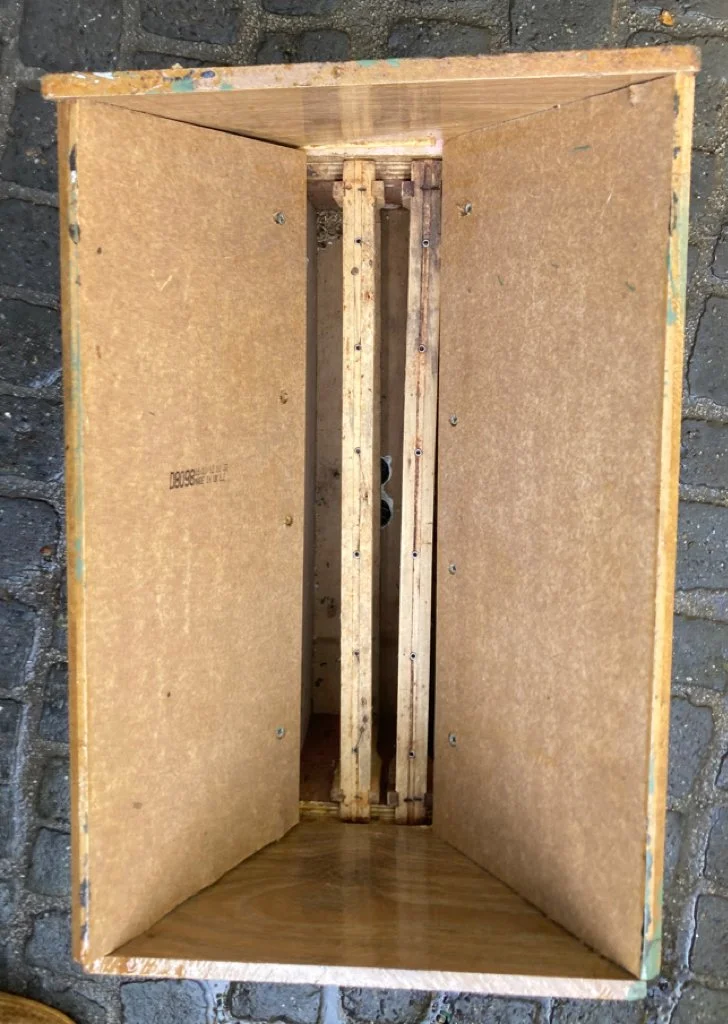 My first design was no good. Bees were prone to huddle against the walls. My modified version has sloping walls covered with PVC.